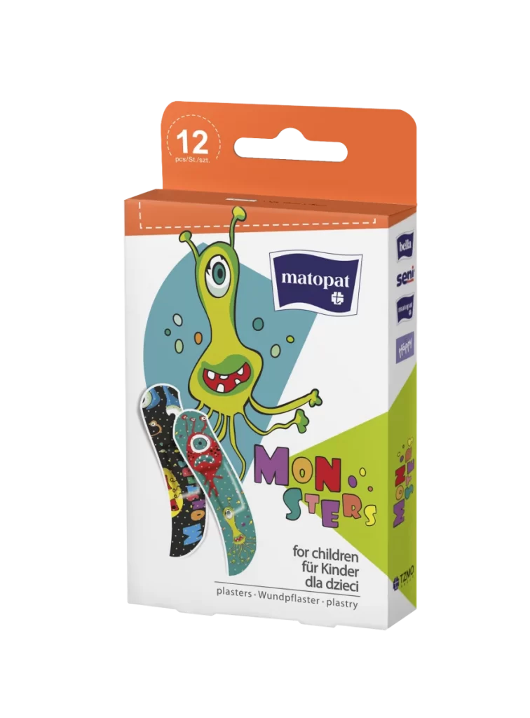 Apósitos finos sobre una base metalizada microperforada con un estampado de divertidos monstruos con un núcleo absorbente situado en el centro que absorbe las secreciones de la herida.